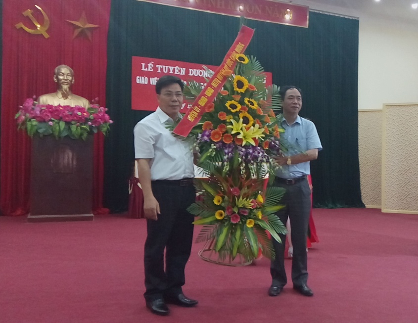 thay mặt Huyện ủy, HĐND - UBND huyện tặng hoa chúc mừng Ngành GD&ĐT huyện